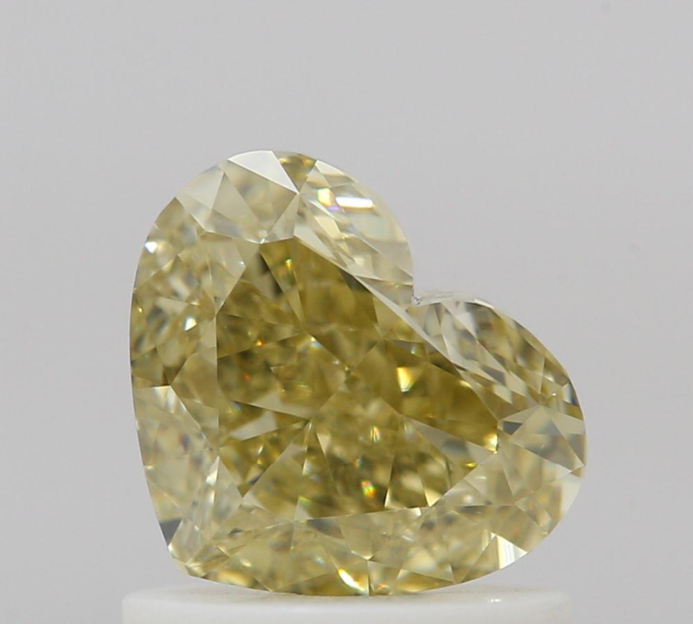 Weight: 1.01 Color: FANCY BROWNISH GREENISH YELLOW Shape: HEART Clarity: VS1 Symmetry: EX Polish: EX Measurement: 5.50 - 6.72 * 3.54 Depth%: 52.70 Table%: 62.00 Lab: GIA Ratio: 0.82 Status: AVAILABLE Black Inclusion: NO BLACK Fluorescence: FAINT Location: IND Fancy Color: YELLOW Fancy Color Overtone: BROWNISH GREENISH Fancy Color Intensity: FANCY