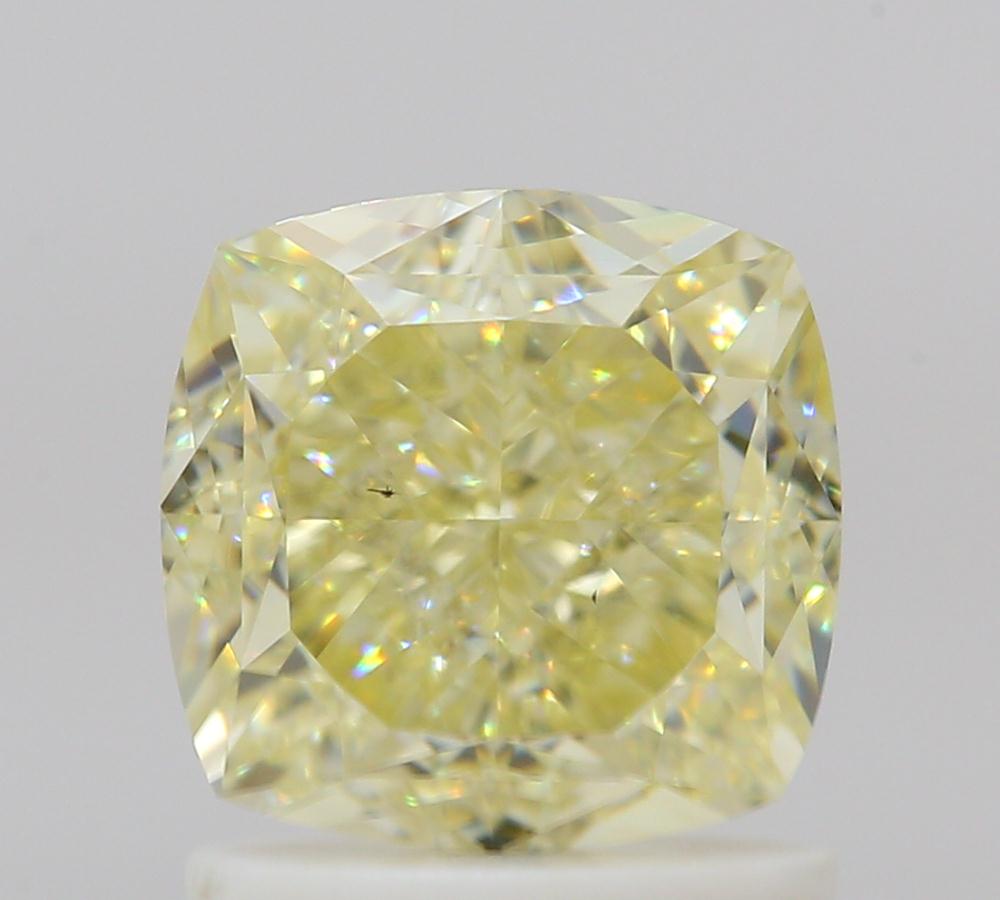 Weight: 1.53 Color: FANCY LIGHT YELLOW Shape: CUSHION Clarity: VS2 Symmetry: VG Polish: EX Measurement: 6.26 - 6.11 * 4.22 Depth%: 69.00 Table%: 63.00 Lab: GIA Ratio: 1.02 Status: AVAILABLE Black Inclusion: SIDE PINPOINT Fluorescence: FAINT Location: HK Fancy Color: YELLOW Fancy Color Intensity: FANCY LIGHT