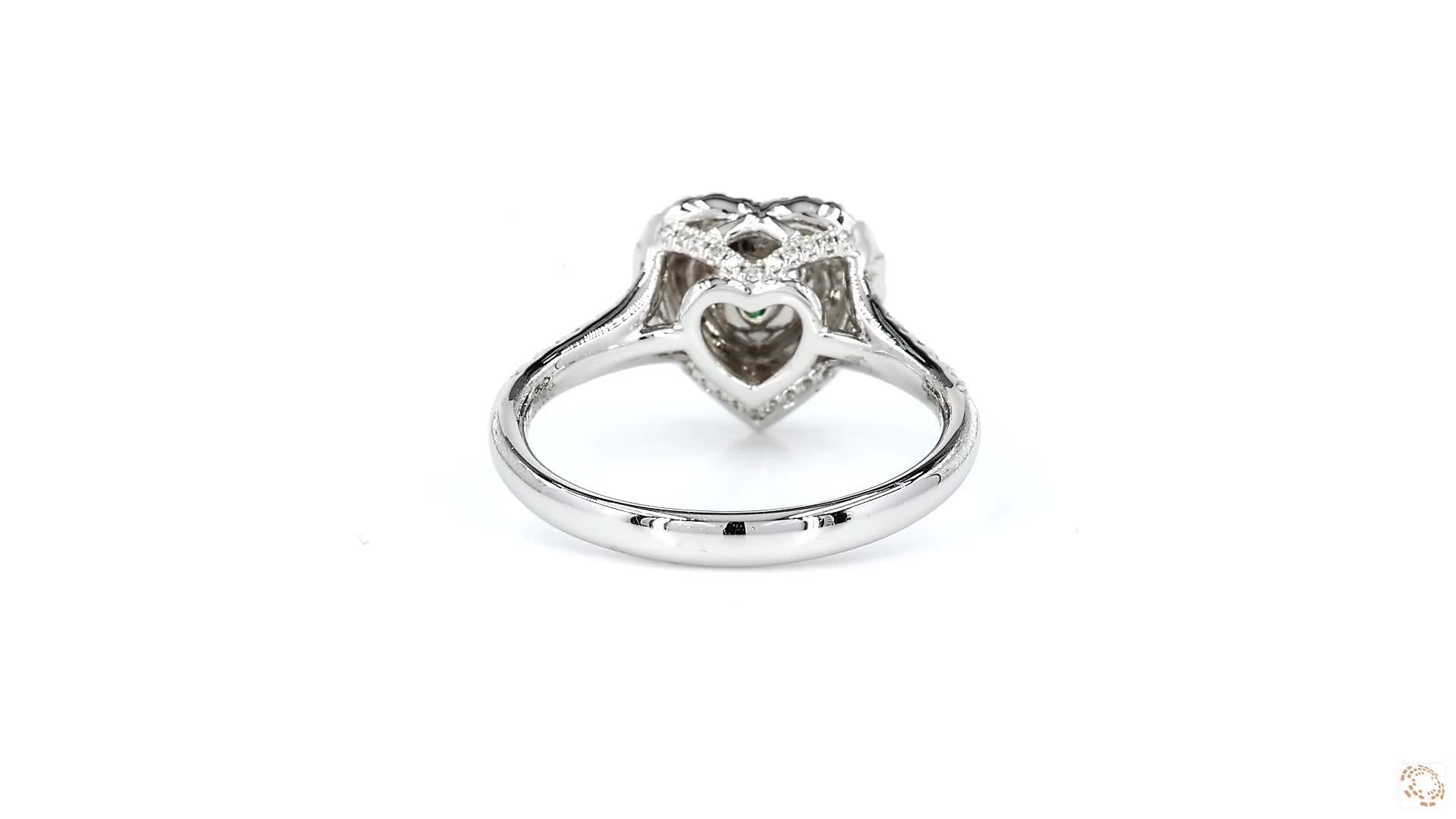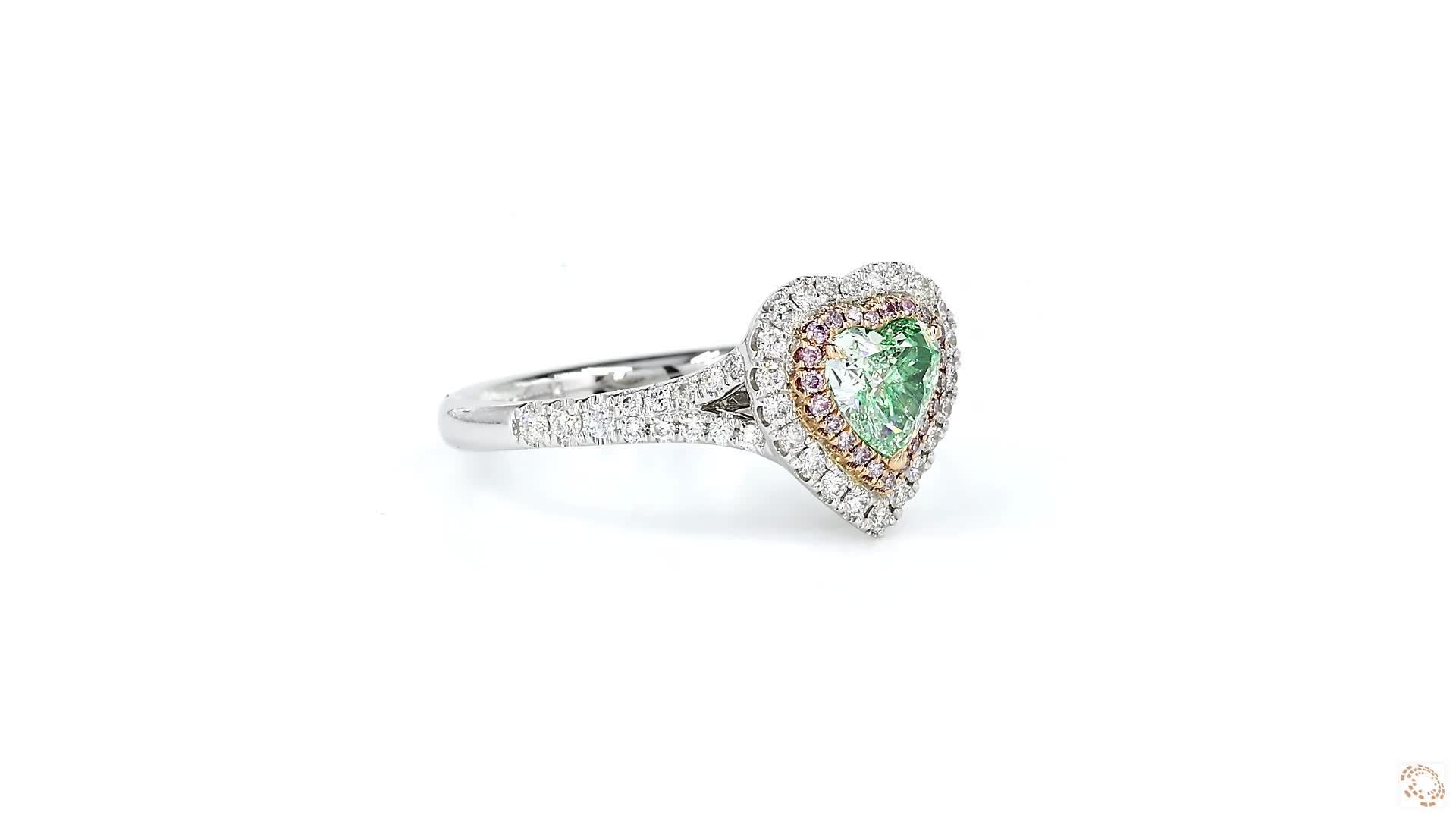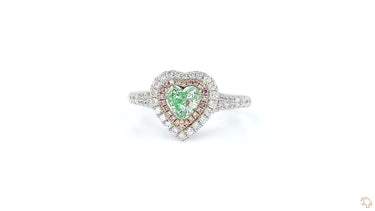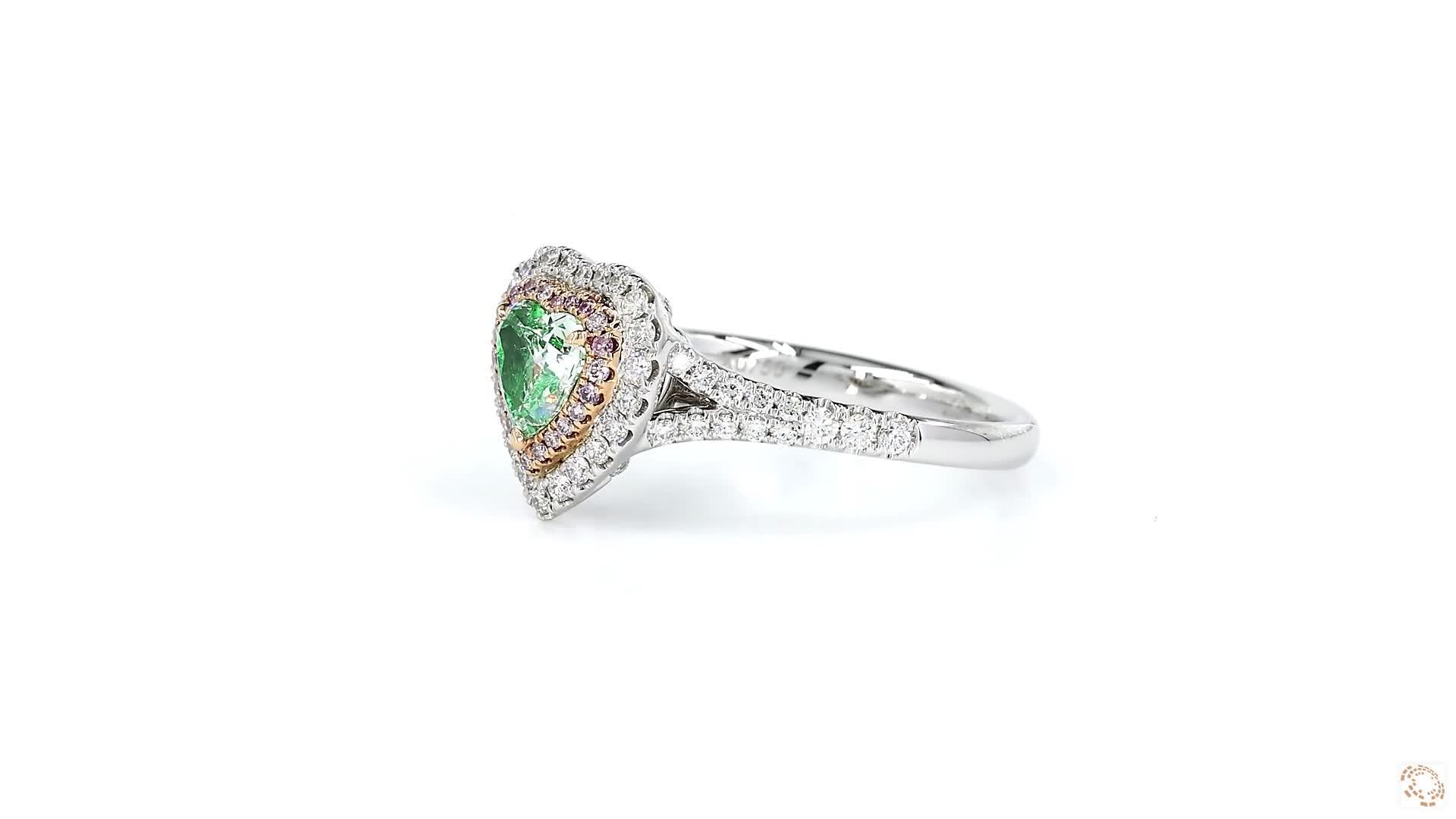 A heart shaped green diamond perfectly framed by pink and white diamonds