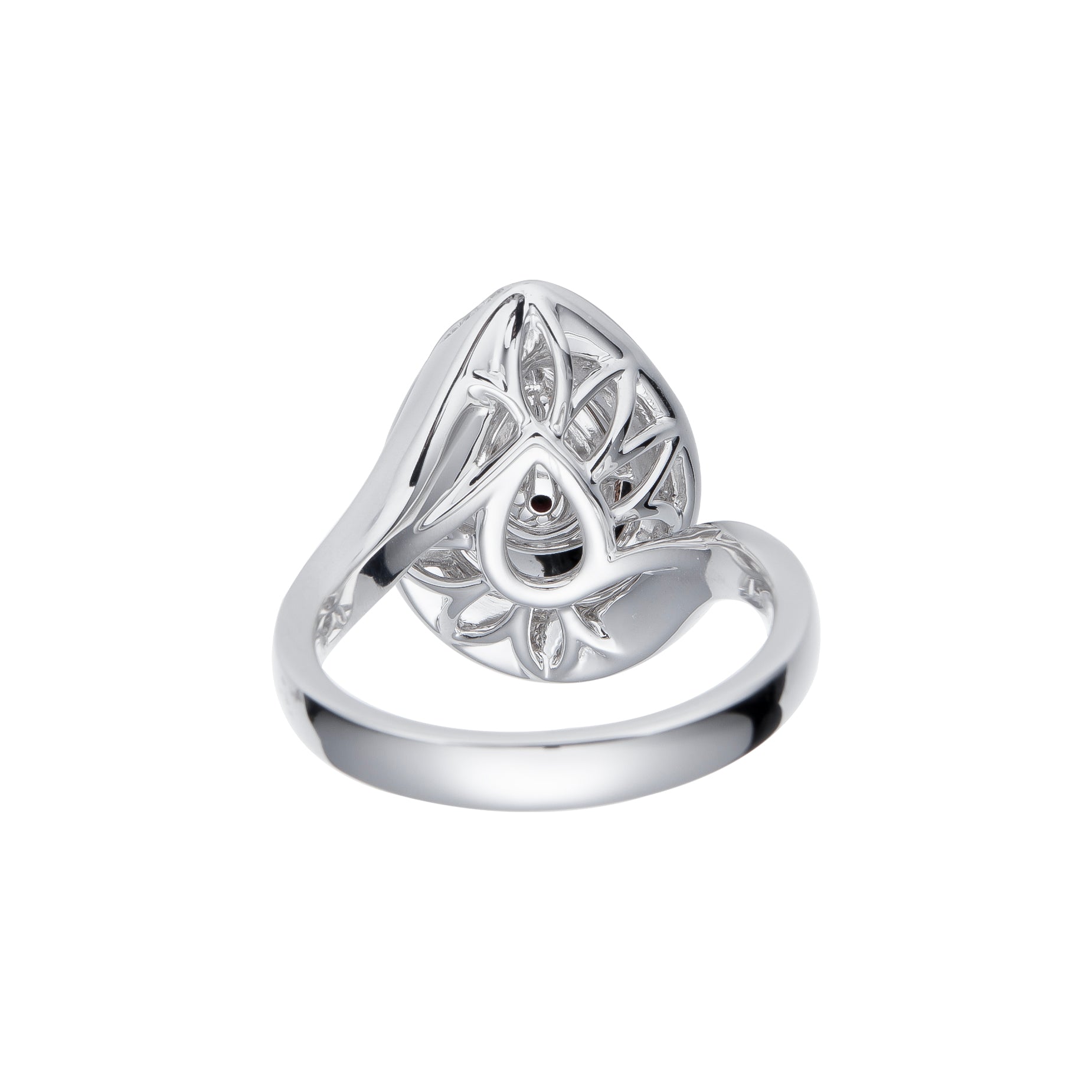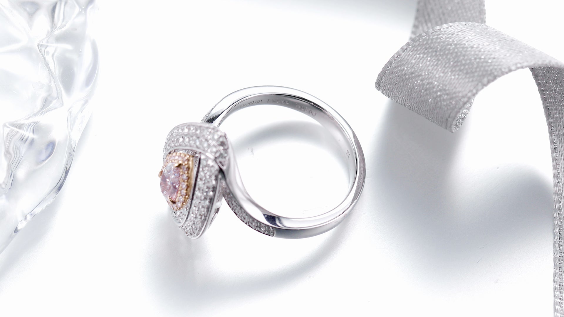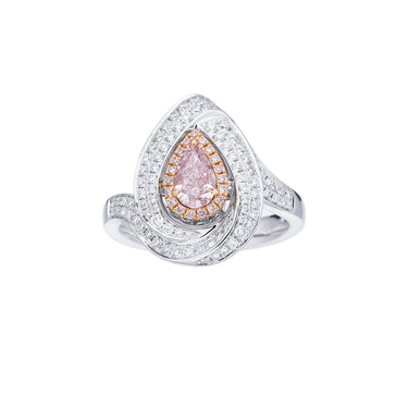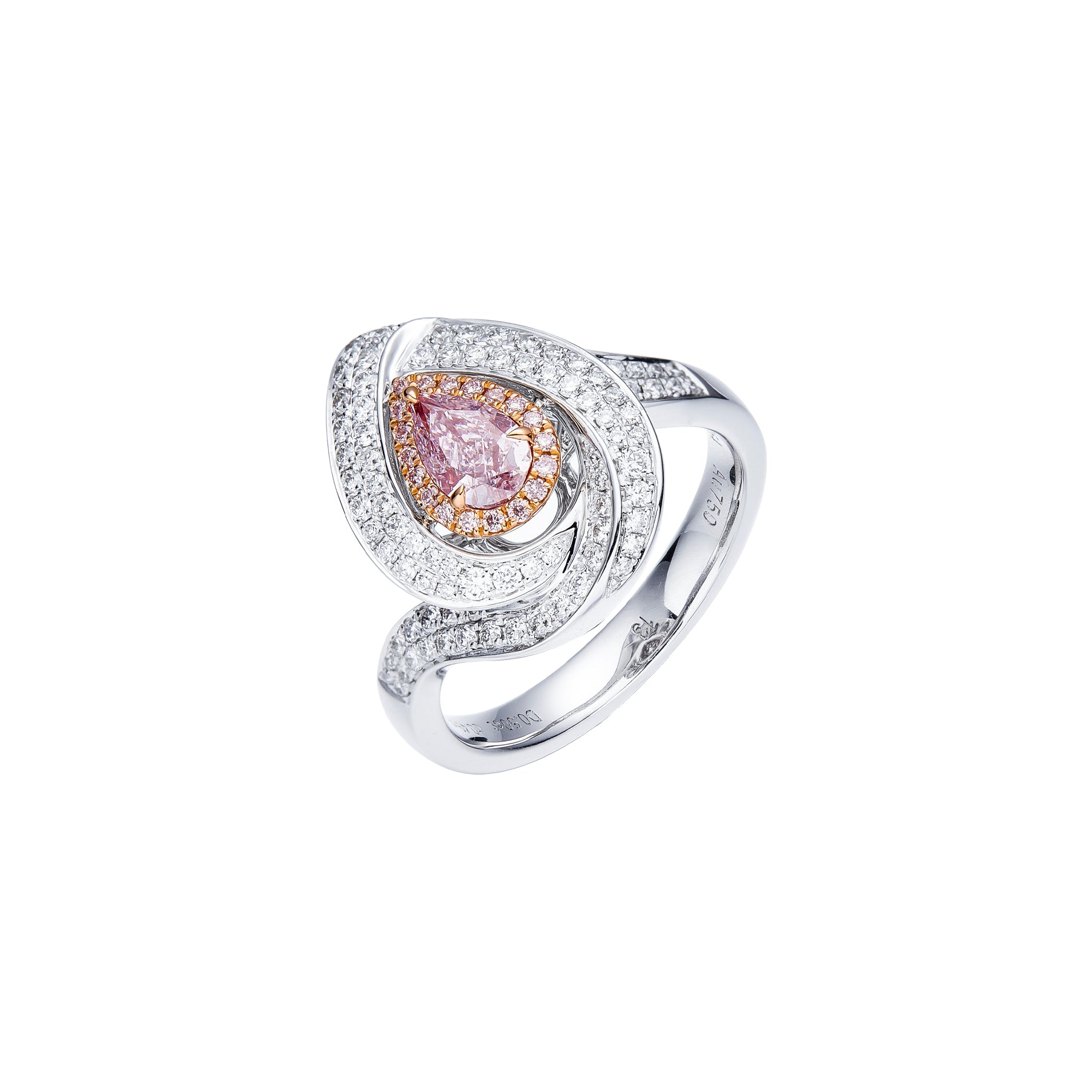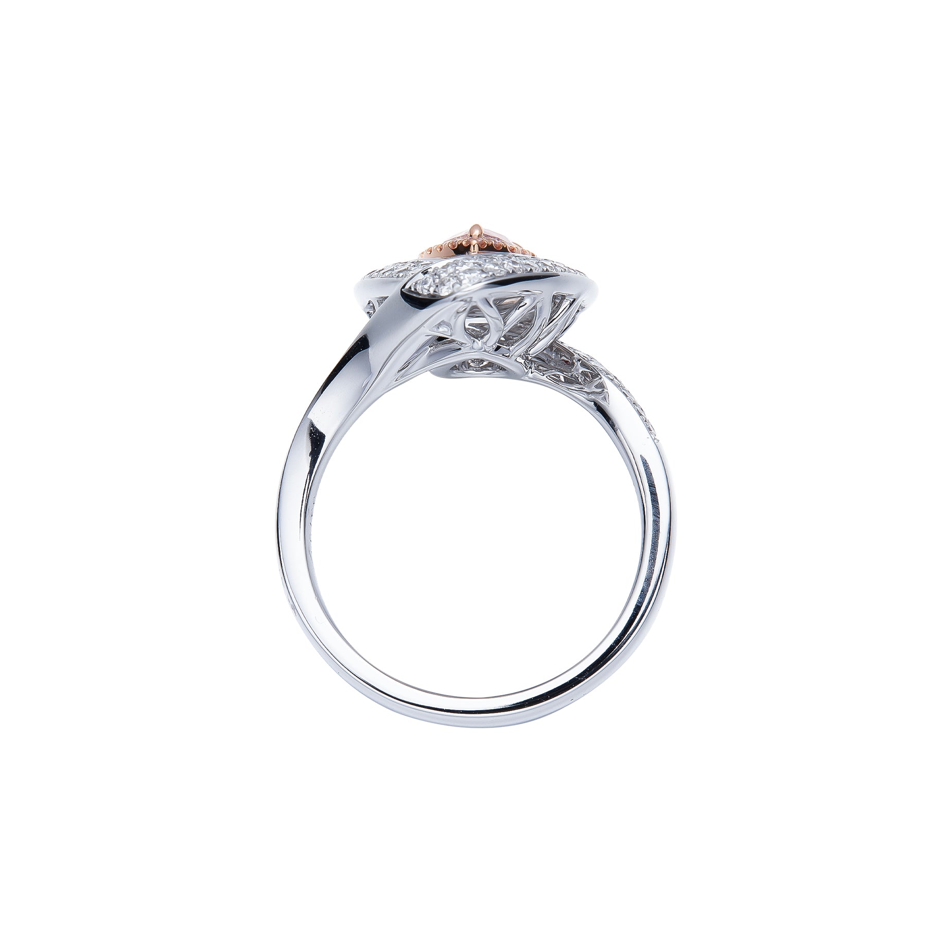 A captivating light pink diamond is framed by a swirling pave design